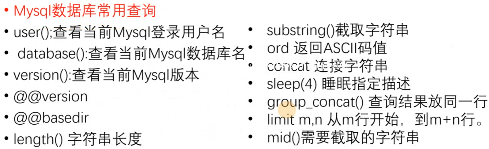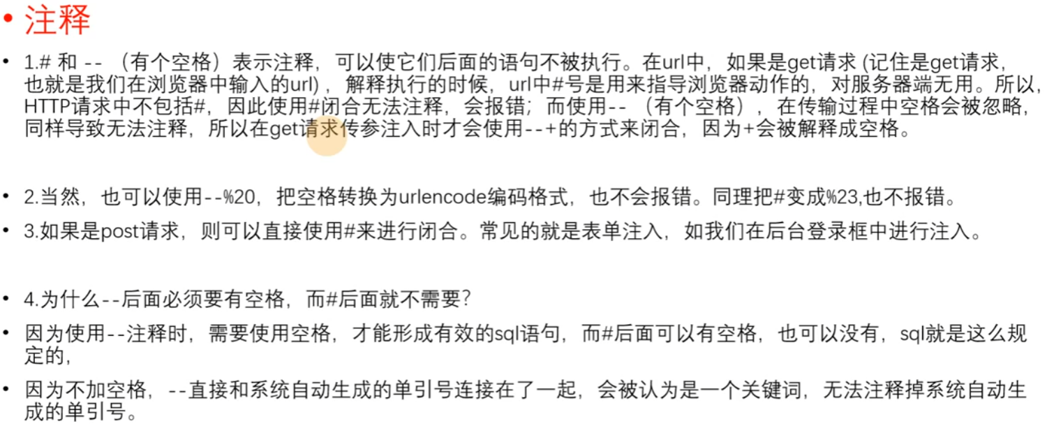 SQL语法 具体不同的数据库还会有自己特有的一些语法结构或者函数等,这些都有可能成为我们注入的工具,但是我们很难成为开拓的人,我们只能去把它们积累起来,为我们以后的攻防作积累。