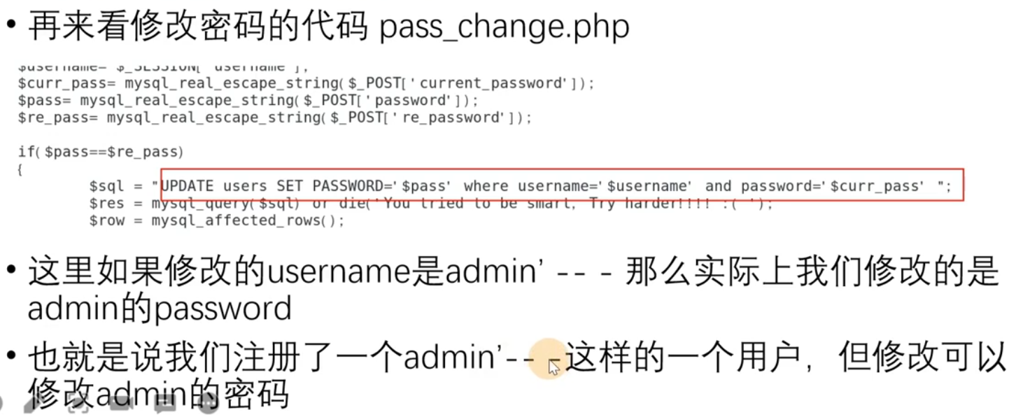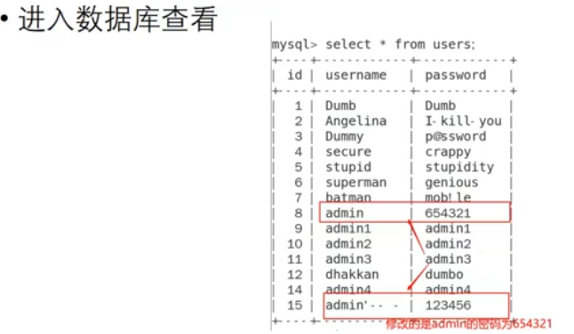 通常二次注入的成因会是插入语句,我们控制自己想要查询的语句插入到数据库中再去找一个能显示插入数据的回显的地方(可能是登陆后的用户名等等、也有可能是删除后显示删除内容的地方~),恶意插入查询语句的示例如下: